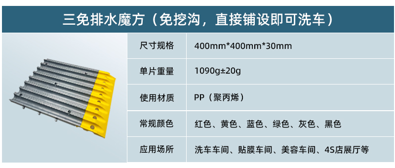 1、免挖溝,直接鋪設(shè)即可洗車(chē)。 2、免清淤,泥沙順自有排水溝直接排走。 3、免防水,接口處打防水膠后徹底防漏水。 4、非常耐用,容易清理、耐油脂、酸和化學(xué)品。 5、極佳承重載力,適合高人流量及轎車(chē)通過(guò)場(chǎng)所。