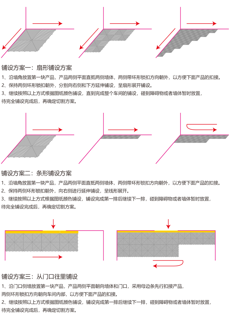 1. 分為3.4.5.厚度,解決不同厚度,統(tǒng)一紋路的問(wèn)題 2. 啞光平紋設(shè)計(jì),防滑,美觀,易清潔 3. 選用高級(jí)原料,加入其他輔料,顏色亮麗,無(wú)異味,無(wú)污染 4. 顏色為紅黃藍(lán)綠黑灰六色,滿(mǎn)足客戶(hù)用色需求,搭配屬于自己的風(fēng)格 5. 通扣鎖扣設(shè)計(jì),容易鋪設(shè)且容易拆卸打理 6. 加強(qiáng)支撐,不容易出現(xiàn)壓壞壓斷現(xiàn)象,滿(mǎn)足大多數(shù)車(chē)輛施工的要求 7. 使用年限長(zhǎng),五年超長(zhǎng)質(zhì)保,使用無(wú)后顧之憂(yōu) 8. 十字支撐,保證承載最大化的同時(shí),且易排泥排水