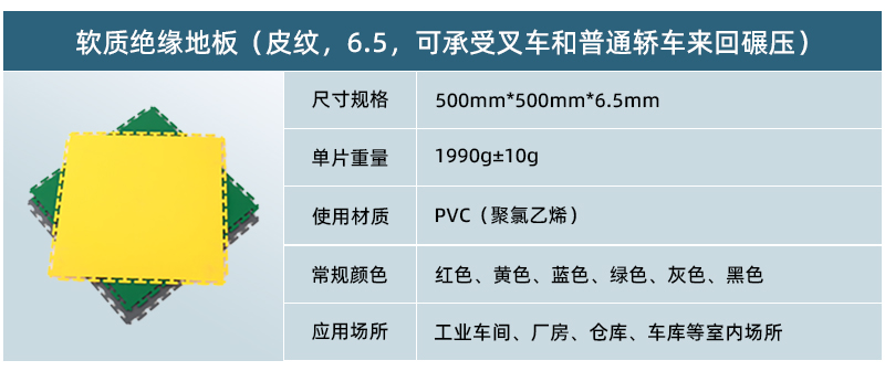 5、高承載,更防滑: 軟質(zhì)絕緣地板為實(shí)心結(jié)構(gòu),只要地面承重沒(méi)有問(wèn)題,其承載能力能夠達(dá)到每平米10噸以上。地板表面在生產(chǎn)過(guò)程中帶有凸起的紋路,讓車(chē)間地面更為防滑。