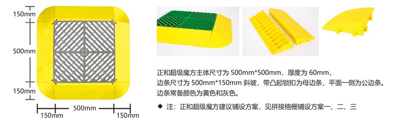 超級(jí)魔方產(chǎn)品綜合了以前產(chǎn)品的所有優(yōu)點(diǎn),包括結(jié)構(gòu)設(shè)計(jì)、防滑紋路、尺寸間距、加大鎖扣、矩陣支撐等,將產(chǎn)品厚度提升到60毫米的超高厚度,真正的實(shí)現(xiàn)了汽車(chē)店鋪的免挖溝鋪設(shè)。